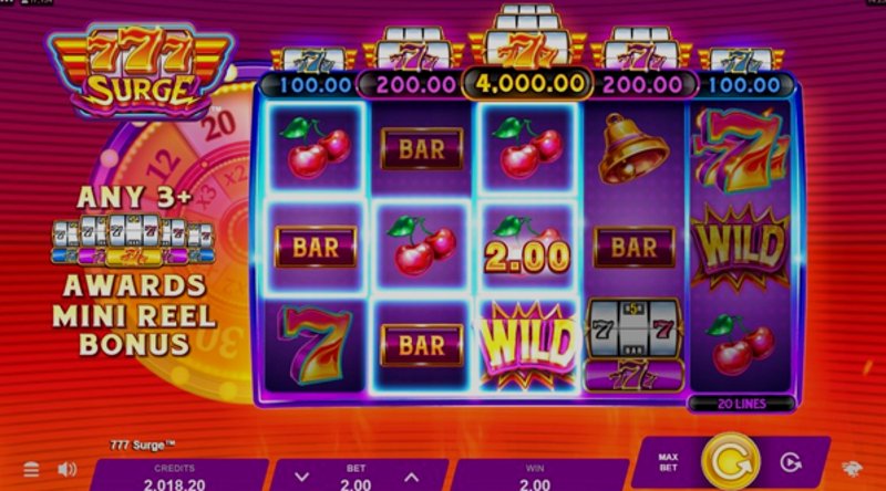 У игрового автомата 777 Surge от Games Global RTP составляет около 96%, а волатильность считается средней, что предполагает более частые, но умеренные выигрыши.