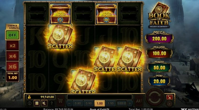 Теперь давайте поговорим об игровом процессе. Book of Faith™ следует популярному формату слота с 5 барабанами и 3 рядами, имеющего 10 линий выплат. Выдающейся особенностью здесь является символ Книги, который выполняет функции как Дикого символа, так и Скаттера. Появление трех и более Книг запускает раунд Бесплатных Спинов, где специальный расширяющийся символ может привести к большим выигрышам.