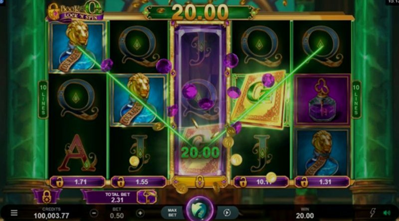 Теперь давайте поговорим об игровом процессе. Book Of Oz имеет классическую компоновку из пяти барабанов и трех рядов с 10 линиями выплат. Основной особенностью игры является магический символ книги, который выполняет функции как диких символов, так и скаттеров. Появление трех или более символов книги запускает функцию бесплатных вращений, где случайным образом выбирается специальный расширяющийся символ, чтобы увеличить ваши шансы на крупный выигрыш.