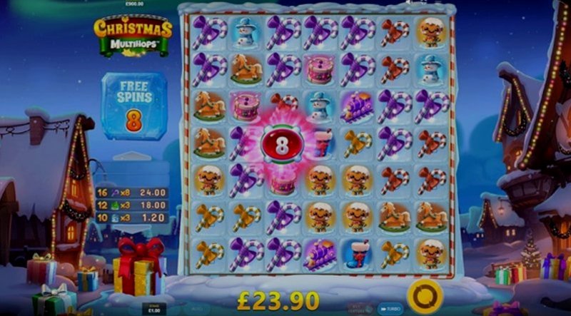 Теперь давайте поговорим об игровом процессе. Christmas Multihops выделяется своими уникальными механиками, которые объединяют множители и каскадные выигрыши. Игра предлагает сетку, заполненную праздничными символами, такими как леденцы, пряничные человечки и украшения. Когда вы получаете выигрышную комбинацию, символы исчезают, освобождая место для новых, которые могут упасть вниз, потенциально создавая новые выигрыши.