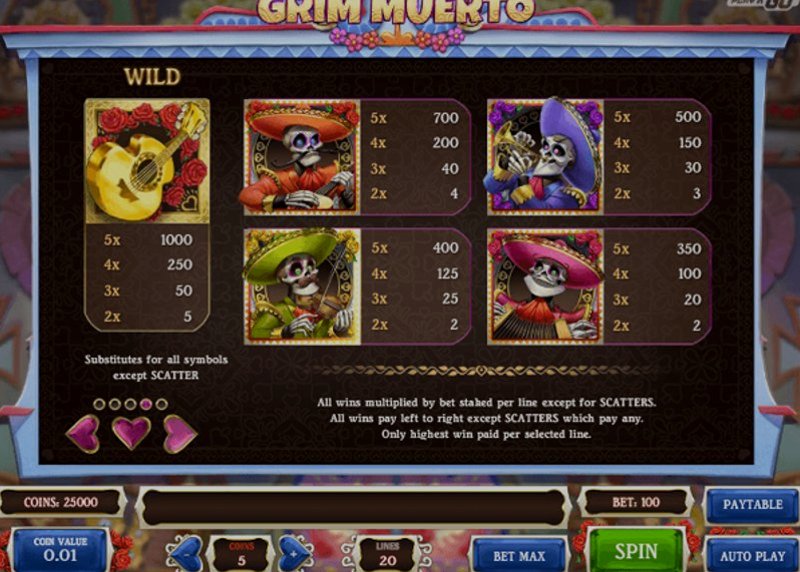 Что касается игрового процесса, Grim Muerto не разочаровывает. Слот имеет 5 барабанов и 20 линий выплат, предлагая множество возможностей для получения выигрышных комбинаций. Обратите внимание на символ гитары, который выступает в роли Wild и может заменять другие символы для создания выигрышных линий.