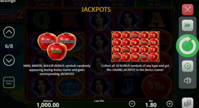 Одним из главных достоинств Magic Apple 2 является разнообразие доступных вариантов ставок. Независимо от того, являетесь ли вы осторожным игроком или высокорисковым, вы найдете размер ставки, который соответствует вашему стилю. Гибкость в ставках позволяет вам настраивать свои ставки в зависимости от вашего бюджета и аппетита к риску, обеспечивая, чтобы каждое вращение соответствовало вашим предпочтениям.