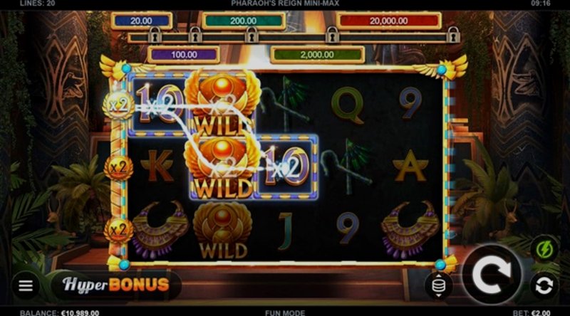 Давайте углубимся в игровую механику Pharaohs Reign. Этот слот предлагает уникальный поворот с функцией HyperBet, позволяющей вам настраивать игровой процесс, изменяя количество золотых символов в игре. Чем больше золотых символов вы активируете, тем выше ваши потенциальные награды, добавляя стратегический элемент в ваш игровой процесс.