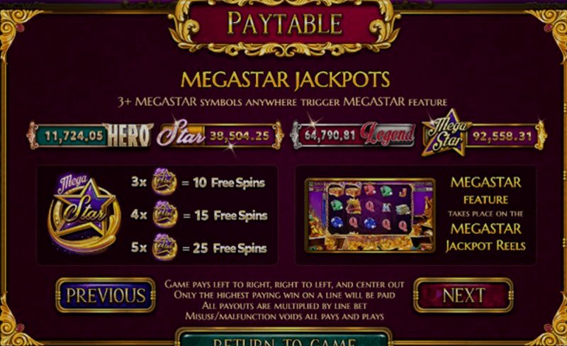 Функция каскадных выигрышей особенно захватывающая, так как выигрышные комбинации взрываются и освобождают место для новых символов, которые могут создать цепные реакции выигрышей. А когда вы активируете режим Megastar, готовьтесь к захватывающему приключению, так как ваши выигрыши умножаются, поднимая ваши доходы на новые высоты!