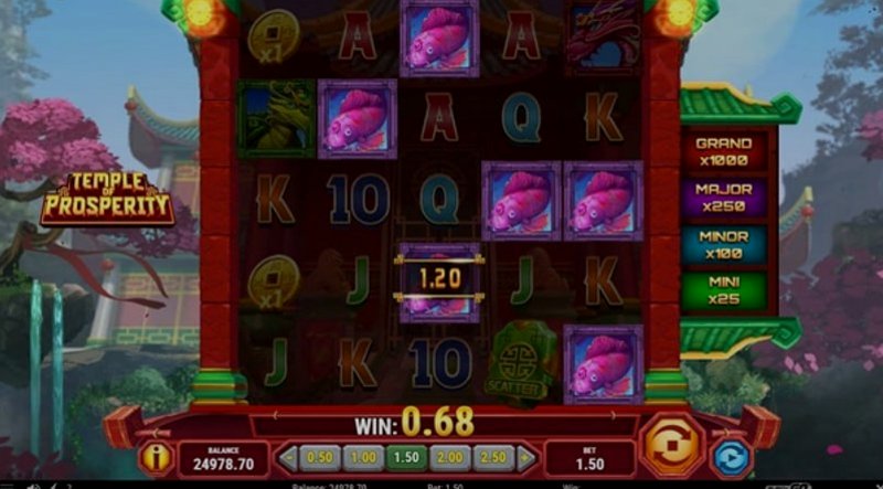 Как только вы запускаете Temple of Prosperity, вас встречает визуально потрясающий фон храма, полный сложных деталей и ярких цветов. Тематика погружает вас в мир богатства и процветания, создавая атмосферу для захватывающего игрового опыта.