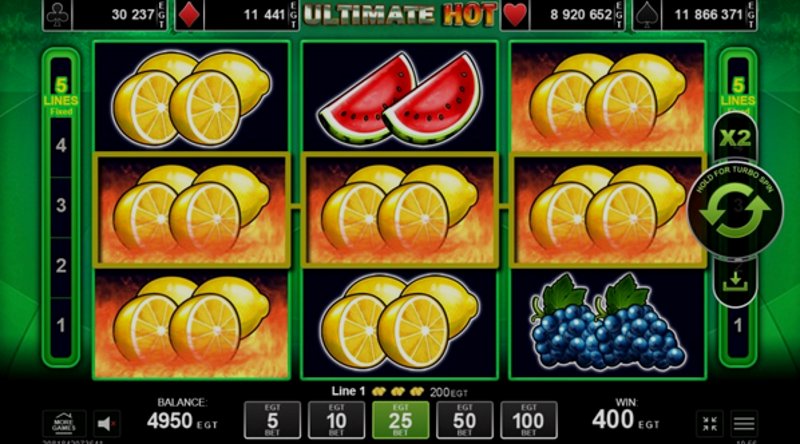 Давайте поговорим об игровом процессе. Ultimate Hot сохраняет простоту с помощью своей сетки 3x3 и пяти линий выплат. Эта простая настройка позволяет легко начать игру, независимо от того, являетесь ли вы опытным игроком или новичком в мире онлайн-слотов. Быстрый темп игры гарантирует, что каждый спин наполнен волнением, а возможность крупных выигрышей держит вас в напряжении.