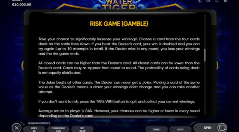 У игрового автомата Water Tiger от Endorphina RTP составляет около 96%, а волатильность считается средней, что предполагает баланс между частыми, но небольшими выигрышами и реже встречающимися крупными выплатами.
